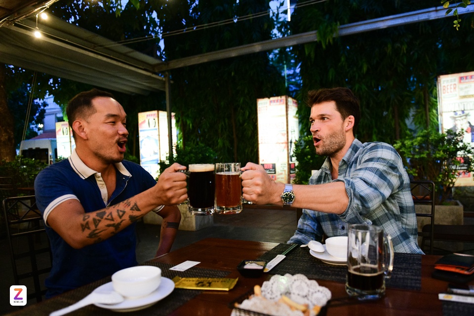 Du khách Mỹ Evan Clark (bên phải) lần đầu thử bia thủ công tại TP.HCM, tháng 10/2024. Ảnh: Phương Lâm. |