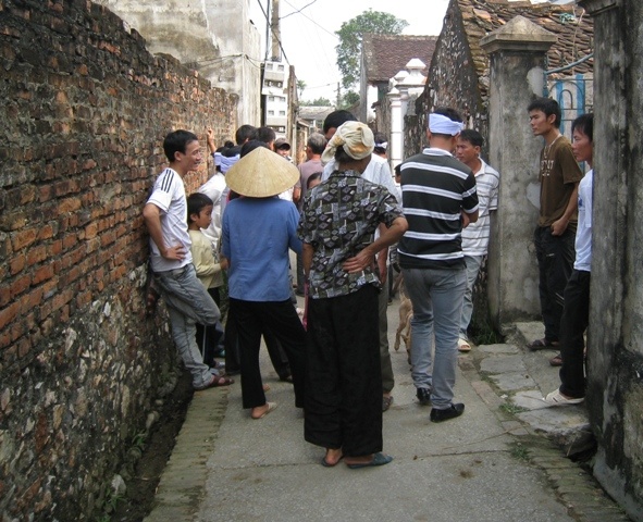 | Người dân thôn Chấn Long 2 tụ tập bên ngoài căn nhà bàn tán xôn xao về cái chết bất thường của người phụ nữ độc thân. |