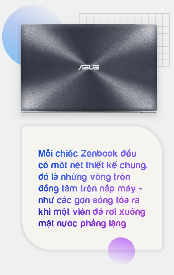 Dù đã có hàng chục sản phẩm với nhiều chất liệu khác nhau, mỗi chiếc Zenbook đều có một nét thiết kế chung, đó là những vòng tròn đồng tâm trên nắp máy.