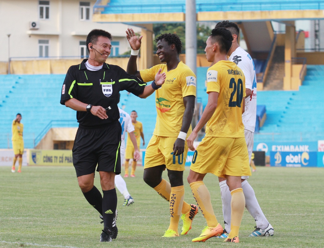 | Trong trận đấu giữa Hà Nội T&T và Thanh Hóa, trọng tài Võ Minh Trí 4 lần thổi penalty. |