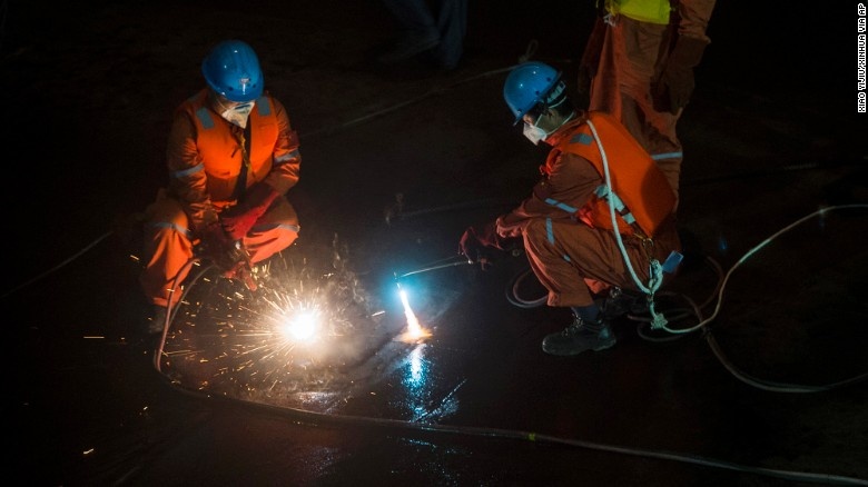 Lực lượng cứu hộ sử dụng đèn khò để cắt lớp vỏ kim loại của tàu, tìm người mắc kẹt. Ảnh: AP |