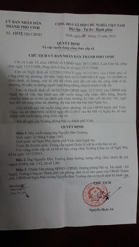 Sự việc hy hữu nói trên xảy ra tại TP Vinh. Theo đó, ngày 15/12, ông Nguyễn Hoài An, Chủ tịch UBND TP ra quyết định tuyển dụng ông Nguyễn Đức Trường vào công chức cấp xã và bố trí chức danh Trưởng công an xã Nghi Phú.