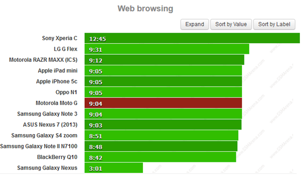 Moto G thực hiện khả năng trình duyệt web liên tục trong hơn 9 giờ, đây là một con số khá tốt. Kết quả này chủ yếu nhờ vi xử lý lõi tứ Qualcomm Snapdragon 400 nền Cortex A7 tiết kiệm điện năng.