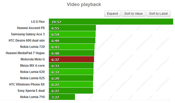 Moto G phát video bằng phần mềm chơi mặc định của máy thì trụ được trong vòng 6 giờ 37 phút trước khi pin sụt xuống mức 10%. Về bài test này, Moto G vẫn đứng trên Nexus 5 nhưng có vẻ Motorola và Google phải tinh chỉnh lại phần mềm phát video mặc định của Moto G.