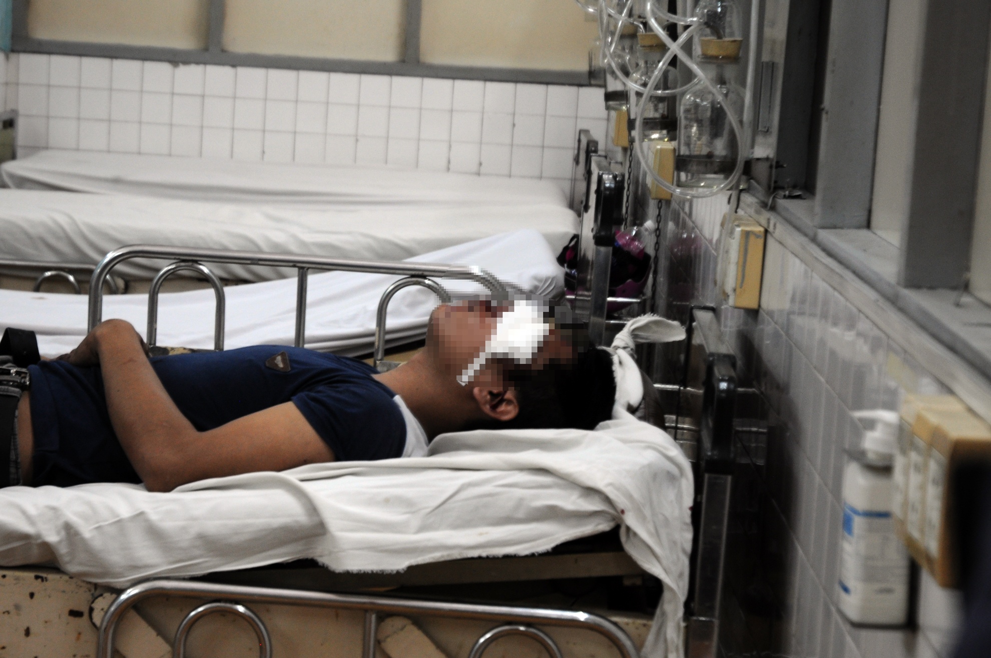 | Người điều khiển xe máy chở nước đá đang cấp cứu tại bệnh viện. Ảnh: Nguyễn Quang. |