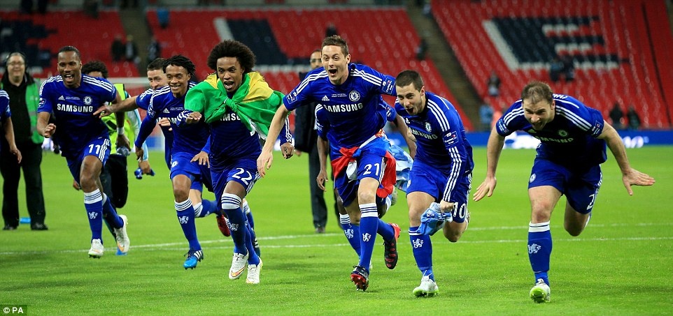 | Cesc Fabregas, Cesar Azpilicueta và Diego Costa giơ chiếc cờ lưu niệm tặng cho những nhà vô địch khi tiếng còi mãn cuộc vang lên. |