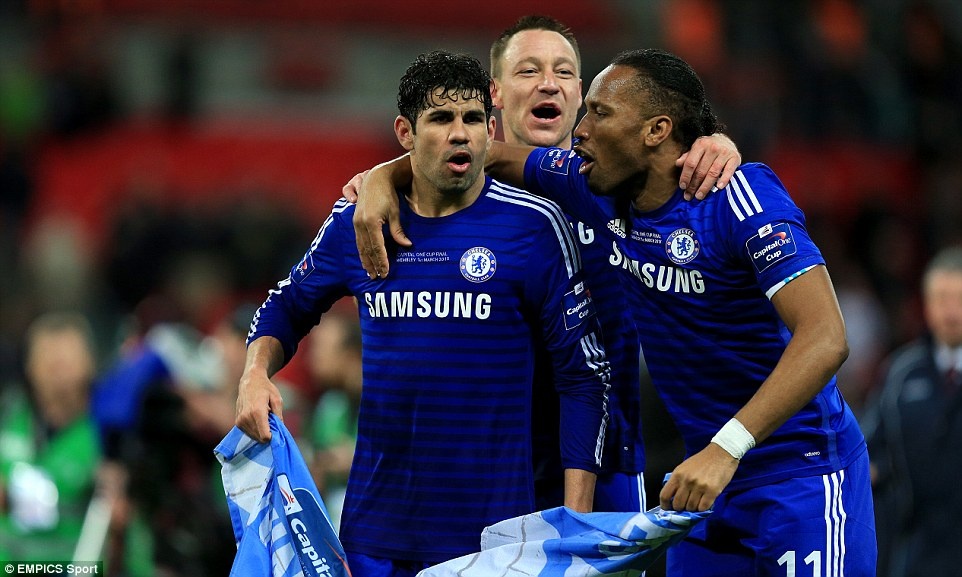 | Drogba chia vui cùng hai đồng đội ghi dấu ấn trong những bàn thắng của Chelsea ở trận chung kết Cúp Liên đoàn Anh, Diego Costa và John Terry. |