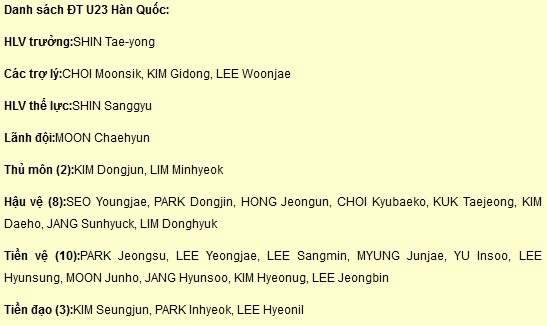 Chất lượng của các cầu thủ U23 Hàn Quốc cũng được đảm bảo khi trong thành phần sang Việt Nam có khá nhiều gương mặt vừa chinh chiến ở Vòng loại U23 châu Á như thủ môn Kim Dongjun, hậu vệ Seo Youngjae, các tiền vệ Lee Yeongjae, Yu Insoo, Jang Hyunsoo… Dự kiến, thầy trò HLV Shin Tae-Yong sẽ có 3 buổi tập trước khi bước vào cuộc đọ sức cùng U23 Việt Nam.