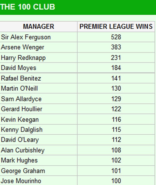 Vị thuyền trưởng Chelsea lập kỷ lục mới khi có 100 chiến thắng sau 142 trận, ít hơn 20 trận so với thời điểm huấn luyện viên huyền thoại Sir Alex Ferguson gia nhập CLB 100. Hiện "Ông già gân" vẫn đang dẫn đầu danh sách những HLV có số trận thắng nhiều nhất Premier League với 528 trận.