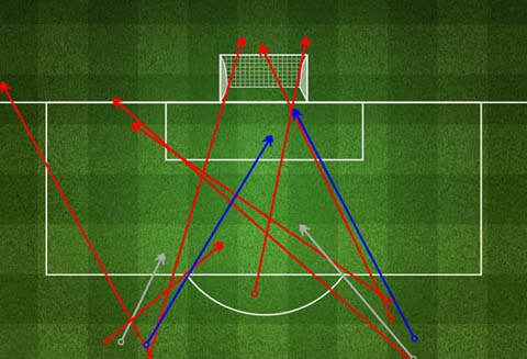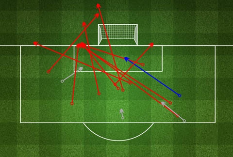 Còn lại, Chelsea buộc Man City phải dứt điểm từ ngoài vòng cấm 12 lần (xem hình dưới), trong đó có 2 lần trúng đích nhưng cả Silva và Jovetic đều không thắng được Cech. Chelsea đã thành công trong việc buộc City phải chấp nhận sút bóng từ xa khi không thể đột phá hay chuyền bóng vào trong