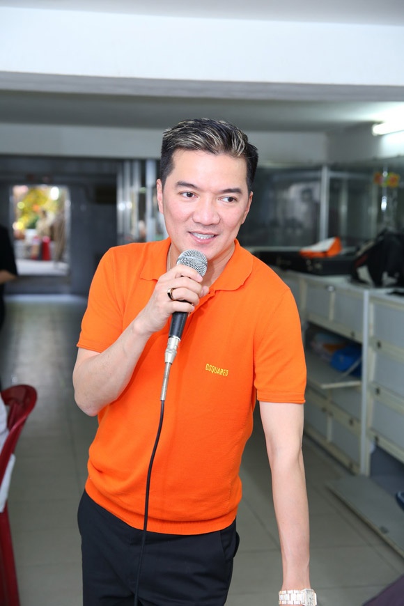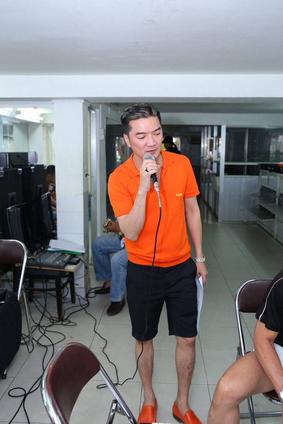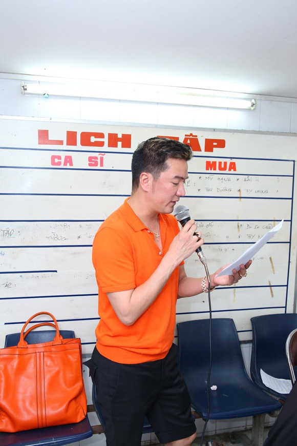| Sáng 23/1, Mr Đàm tham gia buổi tập luyện cho chương trình Tâm sự nàng xuân sẽ được tổ chức trong những ngày gần Tết. Anh gây chú ý với bộ trang phục hàng hiệu đắt tiền màu cam nổi bật và ấn tượng. |