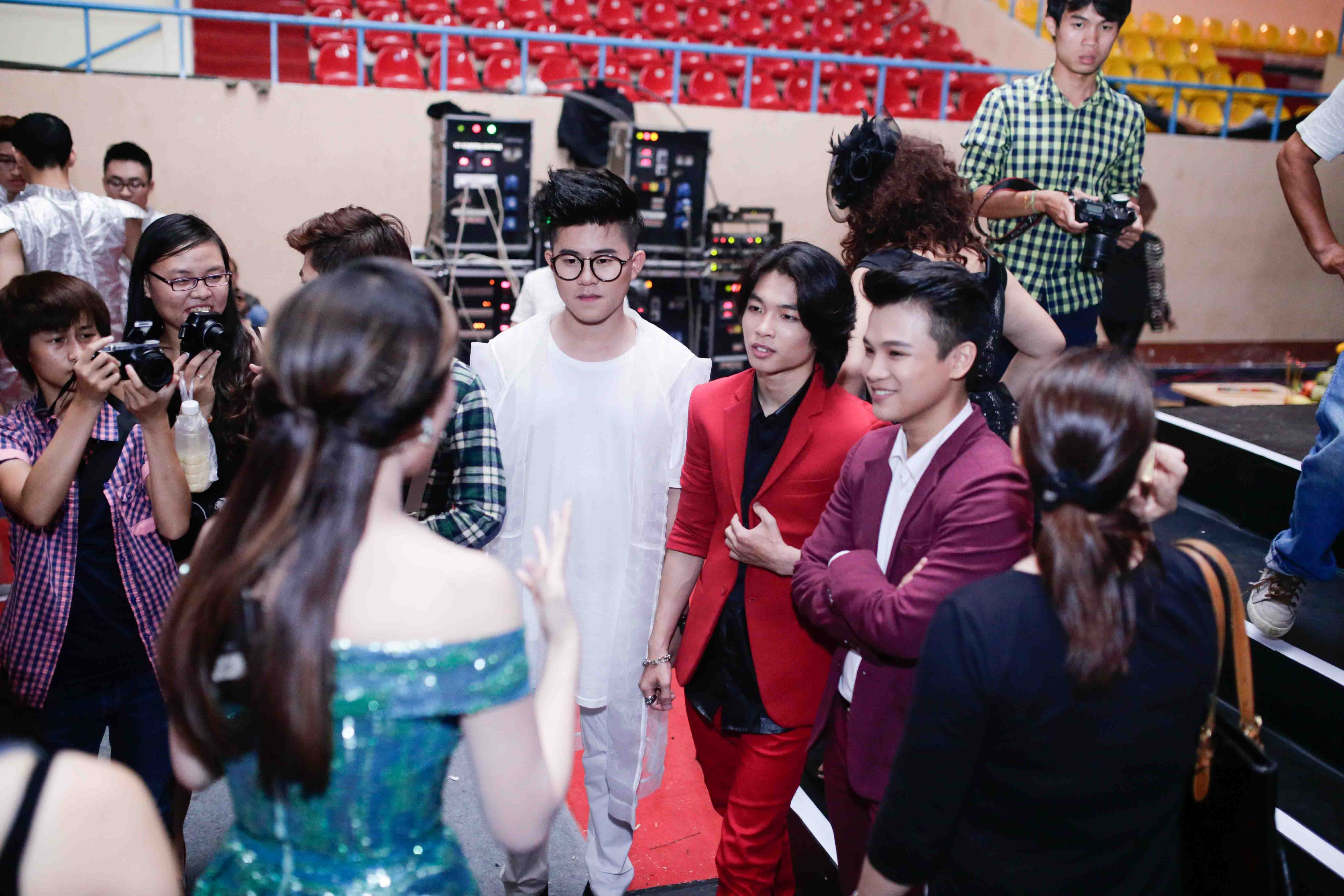 | Là huấn luyện viên của nhóm nam dưới 25, Hồ Quỳnh Hương tranh thủ dặn dò các thí sinh lần cuối trước khi lên sân khấu.
