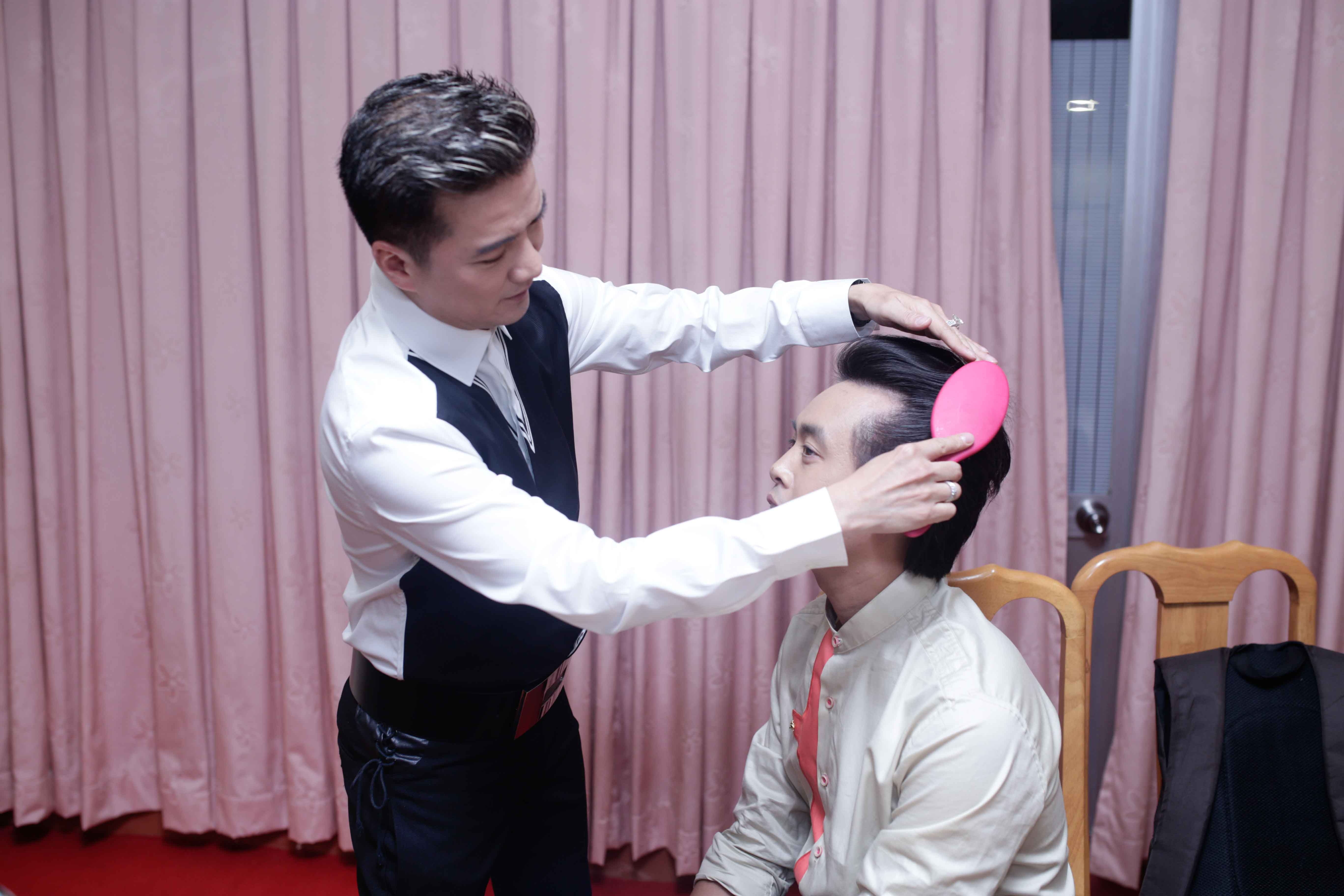 Mr Đàm chăm chú tạo kiểu tóc cho Dương Khắc Linh