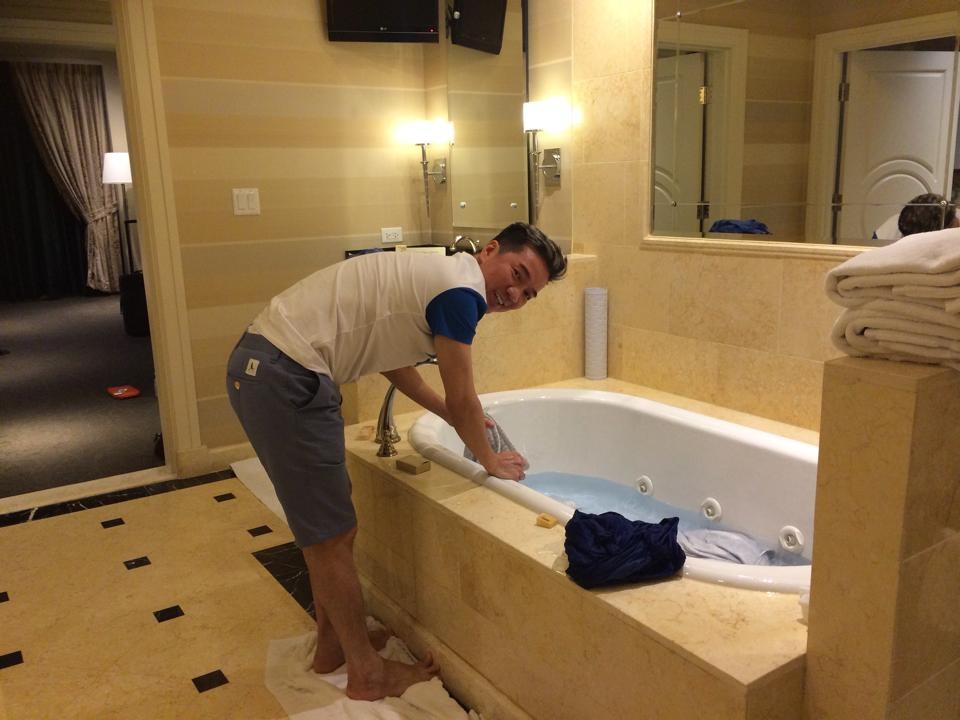 Tối 26/6, Mr Đàm đăng tải hình ảnh đang cặm cụi cọ rửa vali tại khách sạn cùng với lời chia sẻ về lý do khiến anh trở thành người hầu phòng.