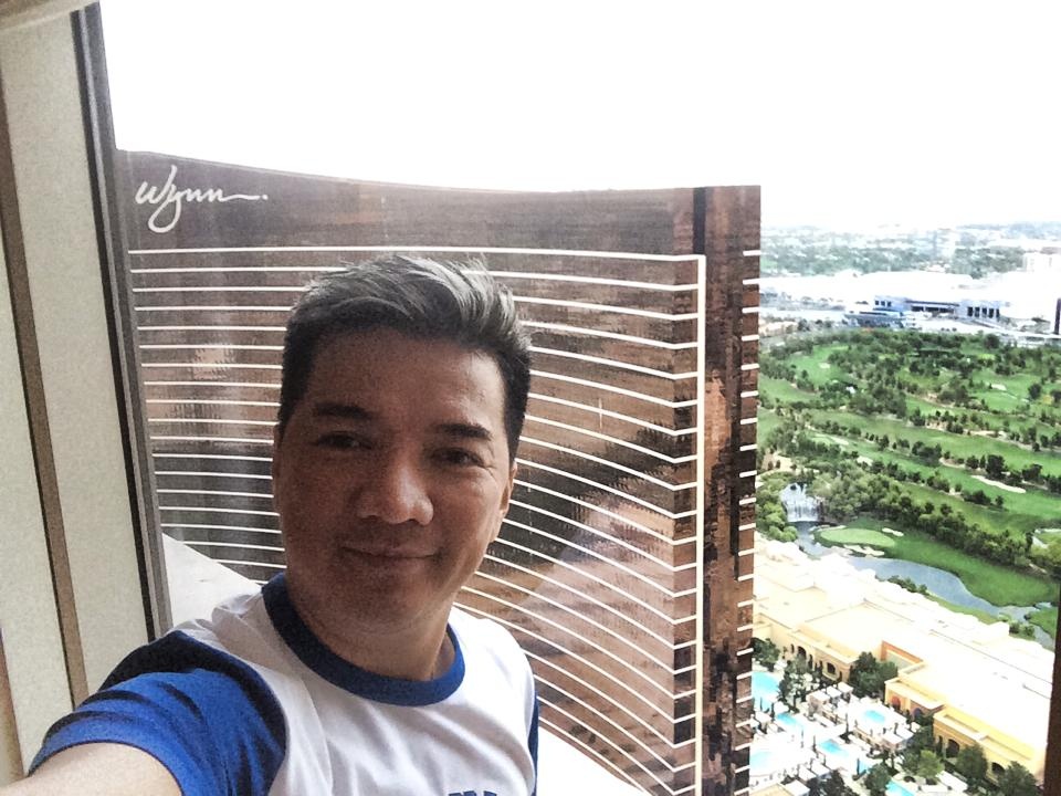 | Mr Đàm chụp ảnh tự sướng tại Las Vegas. |
