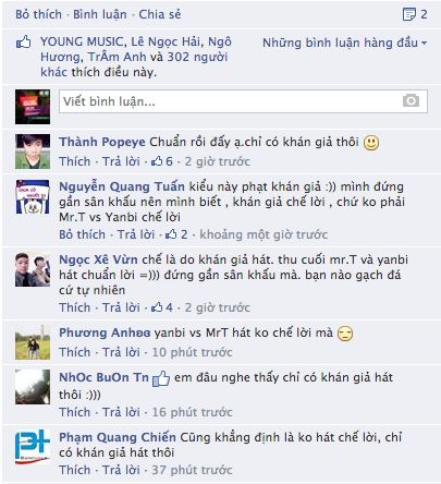 | Những lời bênh vực hộ Mr. T và Yanbi từ khán giả có mặt trong đêm nhạc tổ chức tại Thái Nguyên. |