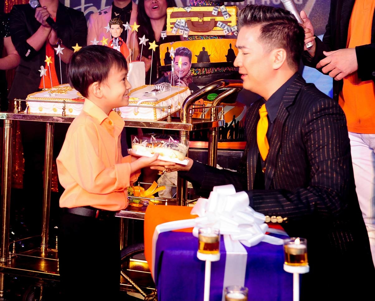 | Anh hôn lên má cậu con trai cưng trong sự xúc động của các khách mời. Cũng trong dạ tiệc, nam ca sĩ mang đến những màn biểu diễn sôi động, khuấy động ca khán phòng. Ngoài ra, anh còn tung hứng trên sân khấu với Dương Triệu Vũ, Thanh Thảo, Lệ Quyên... mang đến bữa tiệc đầy ắp tiếng cười. |