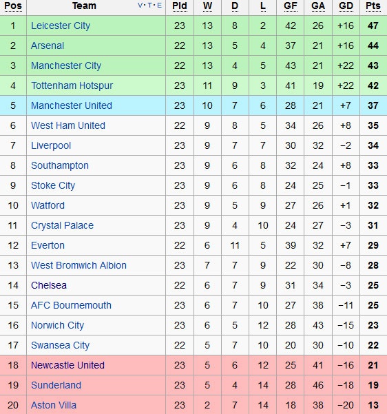 Bảng xếp hạng sau khi kết thúc các trận đấu sớm ở vòng 23 Premier League. |