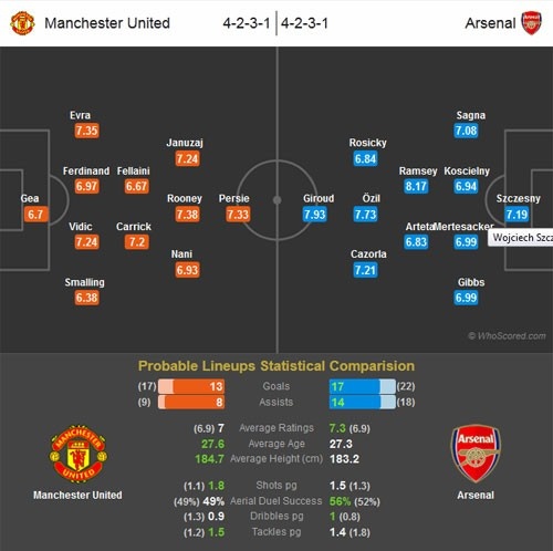 HLV David Moyes quyết định để Januzaj và Fellaini trên băng ghế dự bị. Bên kia chiến tuyến, Arsenal đón chào sự trở lại của Flamini sau khi bình phục chấn thương.