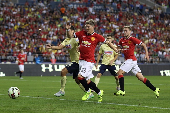 | Schweinsteiger trong tình huống tranh bóng quyết liệt với cầu thủ Club America ở hiệp 2. Ảnh: Getty Images. |