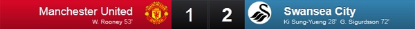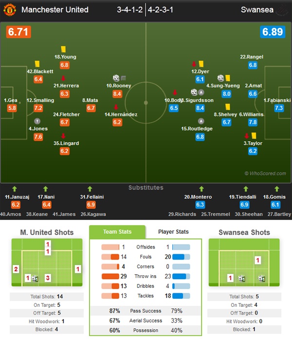 73': Từ tình huống tạt bóng bên cánh phải, Sigurdsson nâng tỷ số lên 2-1 cho Swansea sau cú sút rất căng trong khu vực 16m50. Trong pha bóng này, các hậu vệ M.U mắc lỗi không theo sát cầu thủ đối phương.