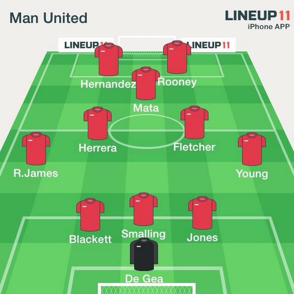 M.U: De Gea; Jones, Smalling, Blackett; Young, Fletcher, Herrera, James; Mata; Rooney, Hernandez.