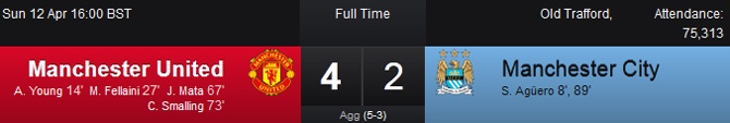 M.U chấm dứt chuỗi 4 trận thất bại trước Man City bằng chiến thắng 4-2 ở derby Manchester lượt về diễn ra trên sân nhà Old Trafford. Cầu thủ gây ấn tượng nhất trong đội hình Quỷ đỏ là tiền vệ chạy cánh Ashley Young. Anh ghi một bàn và thực hiện hai pha kiến tạo. Vượt qua đội bóng láng giềng Man City, M.U vững vàng ở vị trí thứ 3 trên bảng xếp hạng với 65 điểm sau vòng 32 Ngoại hạng Anh.