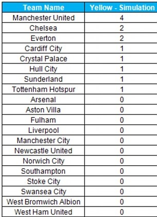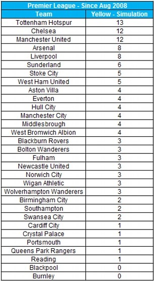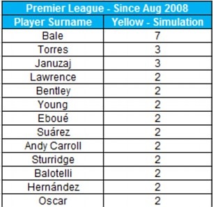 Một điều đáng lưu ý là hai cầu thủ mang tiếng là vua đóng kịch Ashley Young (MU) và Luis Suarez (Liverpool) mới chỉ phải nhận 2 thẻ vàng tính từ tháng 8/2008.