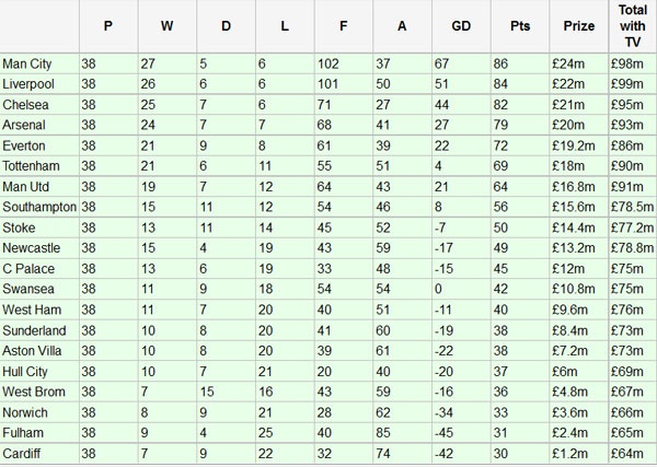 Còn về khoản tiền thưởng, đội vô địch Man City nhận được 24 triệu bảng. Trong khi đó, các đội xếp từ thứ 2 đến thứ 4 hơn kém nhau 1 triệu bảng. Đối với các CLB đứng ngoài top 4, mức chênh lệch trong cách phân chia tiền thưởng giữa mỗi vị trí trên bảng xếp hạng Premier League là 1,2 triệu bảng.