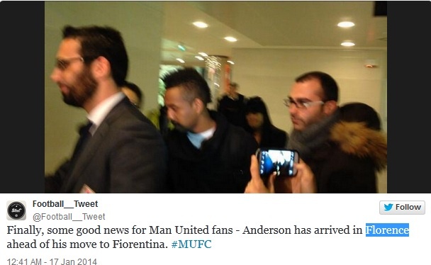 Việc Anderson chia tay MU không phải thông tin quá bất ngờ ngay cả đối với các CĐV của Quỷ đỏ. Minh chứng là một Manucian đã lên Twitter thông báo một cách hào hứng: “Cuối cùng tin vui cũng đến với fan Man United – Anderson đã có mặt tại Florence để đầu quân cho Fiorentina”.