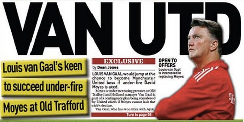 Trong bài báo mới phát hành có tiêu đề "Van Utd" của cây viết Dean Jones (Sunday People), đã tiết lộ thông tin HLV Loui van Gaal rất muốn thay thế vị trí của David Moyes để đưa M.U tới thành công.