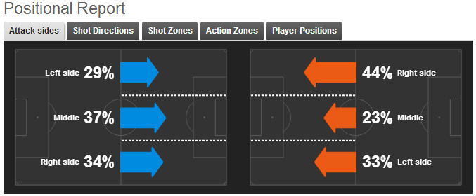 Đêm qua, tại chính Bay Arena, hình ảnh một Man Utd chơi cánh ngây thơ và thần tốc được tái hiện. Đại diện tiêu biểu cho hình ảnh đó là một Valencia quá nguy hiểm bằng tốc độ và sự nhịp nhàng giữa công và thủ. Bên cánh trái, Nani cũng cống hiến một trận đấu xuất sắc nhất của mình kể từ khi mùa bóng mới khởi tranh. Anh cùng phần còn lại chơi như thể vừa được trả tự do sau chuỗi ngày bị giam hãm. Bóng không còn bị díu lại ở giữa sân, mà được đẩy ra hai biên một cách triệt để, dẫn đến sức mạnh tấn công tăng lên đáng kể. Biểu đồ dưới đây chỉ thấy rõ đâu là điểm khác biệt làm nên một siêu thắng lợi của Man Utd.
