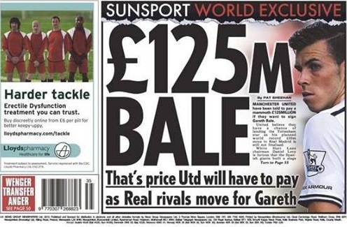 | Tờ Sunsport đưa tin MU duyệt chi 125 triệu bảng vì Bale. |