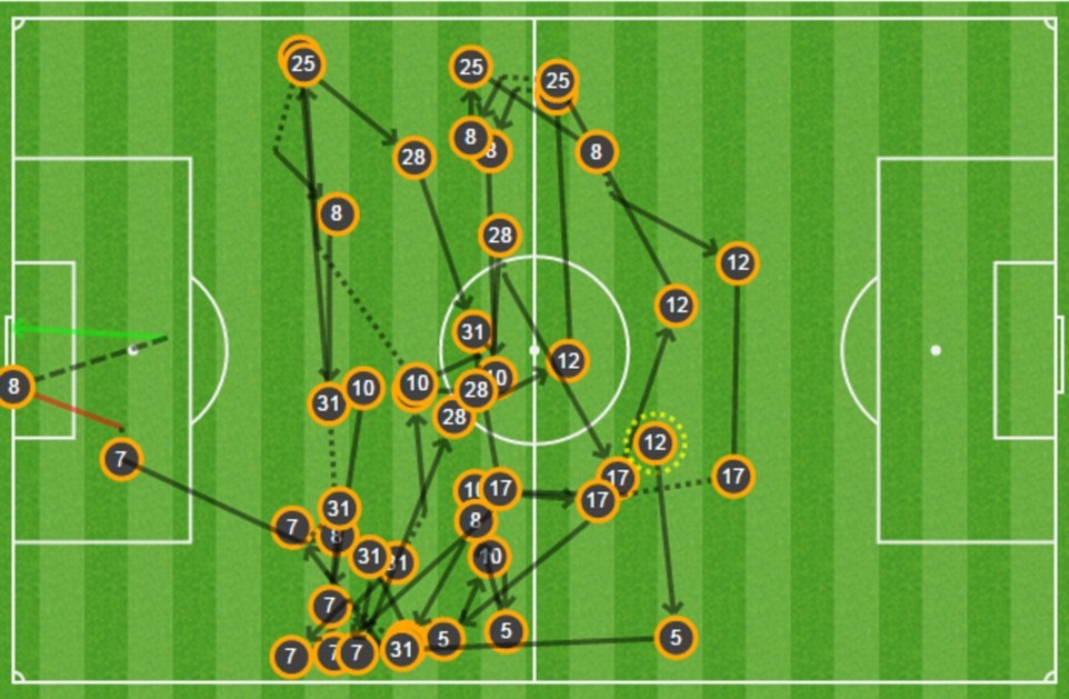 | Đồ họa mô phỏng tình huống dẫn đến bàn thắng thứ 3 của MU được thực hiện sau 45 đường chuyền. |