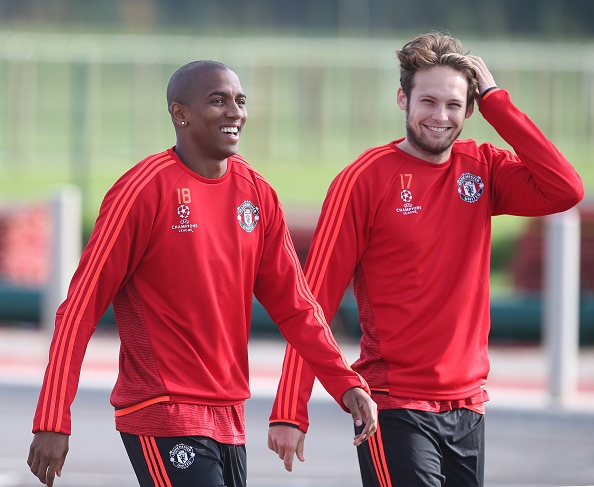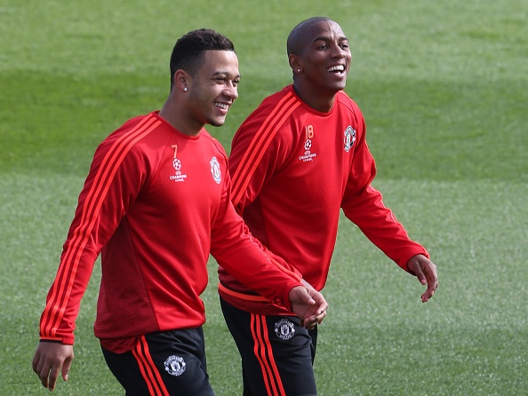 | Ashley Young và Memphis Depay thay nhau giữ vai trò tổ chức tấn công bên cánh trái trong đội hình MU. Họ tỏ ra khá thân thiết trên sân tập. |