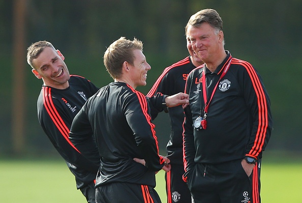 | Huấn luyện viên Van Gaal cùng cộng sự cười đùa trong buổi tập của MU. Ông yêu cầu các học trò phải giành chiến thắng trên sân nhà Old Trafford ở Champions League. |