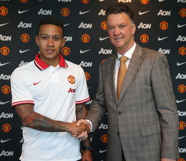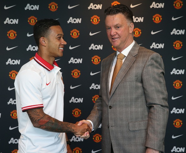 | HLV Van Gaal có mặt trong buổi ký hợp đồng 4 năm khoác áo M.U của Memphis Depay. Mức phí chuyển nhượng của anh là 25 triệu bảng. |