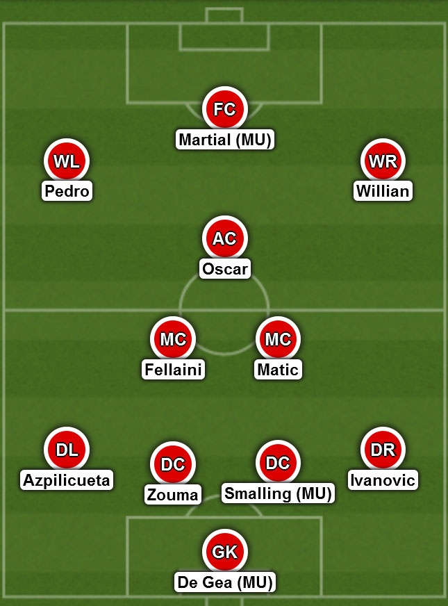 Anthony Martial (MU): Tiền đạo Diego Costa của Chelsea vắng mặt do án phạt 5 thẻ vàng, trong khi đồng đội Wayne Rooney chưa tìm lại phong độ, nên Martial được lựa chọn cho vị trí trung phong. Mùa này, anh đã ghi 4 bàn và thực hiện 14 đường chuyền quan trọng sau 13 trận.