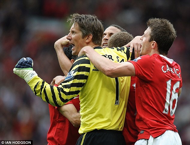 | Thủ môn Van der Sar vượt qua Peter Schmeichel để chiếm vị trí trong khung thành. Anh có 3 lần lọt vào đội hình tiêu biểu năm của PFA (Hiệp hội cầu thủ chuyên nghiệp Anh). Thủ môn người Hà Lan giành 4 danh hiệu Premier League cùng Quỷ đỏ, trong đó có 3 chức vô địch liên tiếp từ năm 2006 - 2009. Ngoài ra, anh còn là người hùng của M.U trong loạt sút penalty ở trận chung kết Champions League năm 2008. |