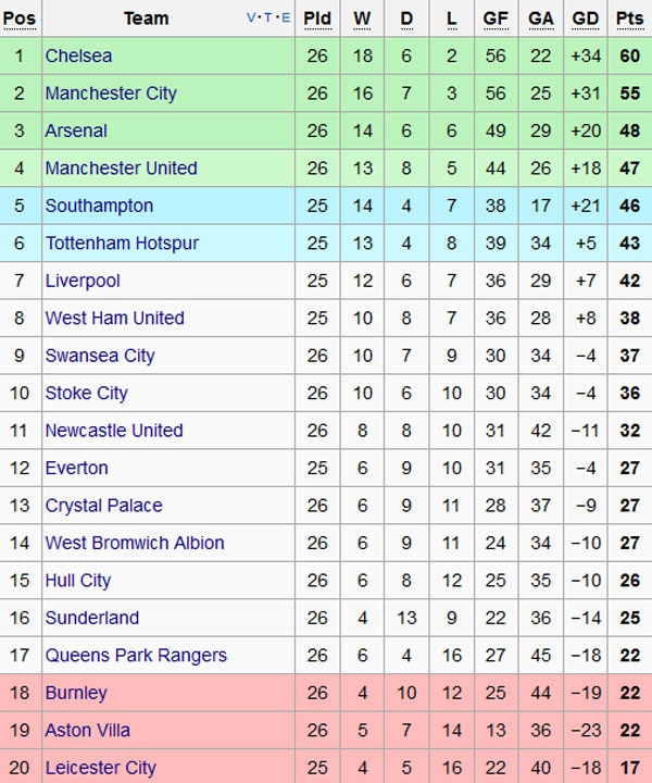 Bảng xếp hạng Ngoại hạng Anh trước khi vòng 26 diễn ra. M.U đứng thứ 3 và còn kém đội đầu bảng Chelsea tới 12 điểm.