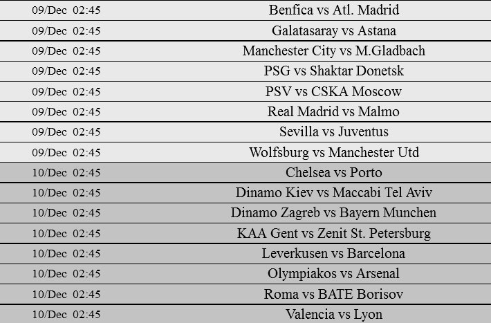| Lịch thi đấu lượt trận cuối vòng bảng Champions League diễn ra giữa tuần này. |