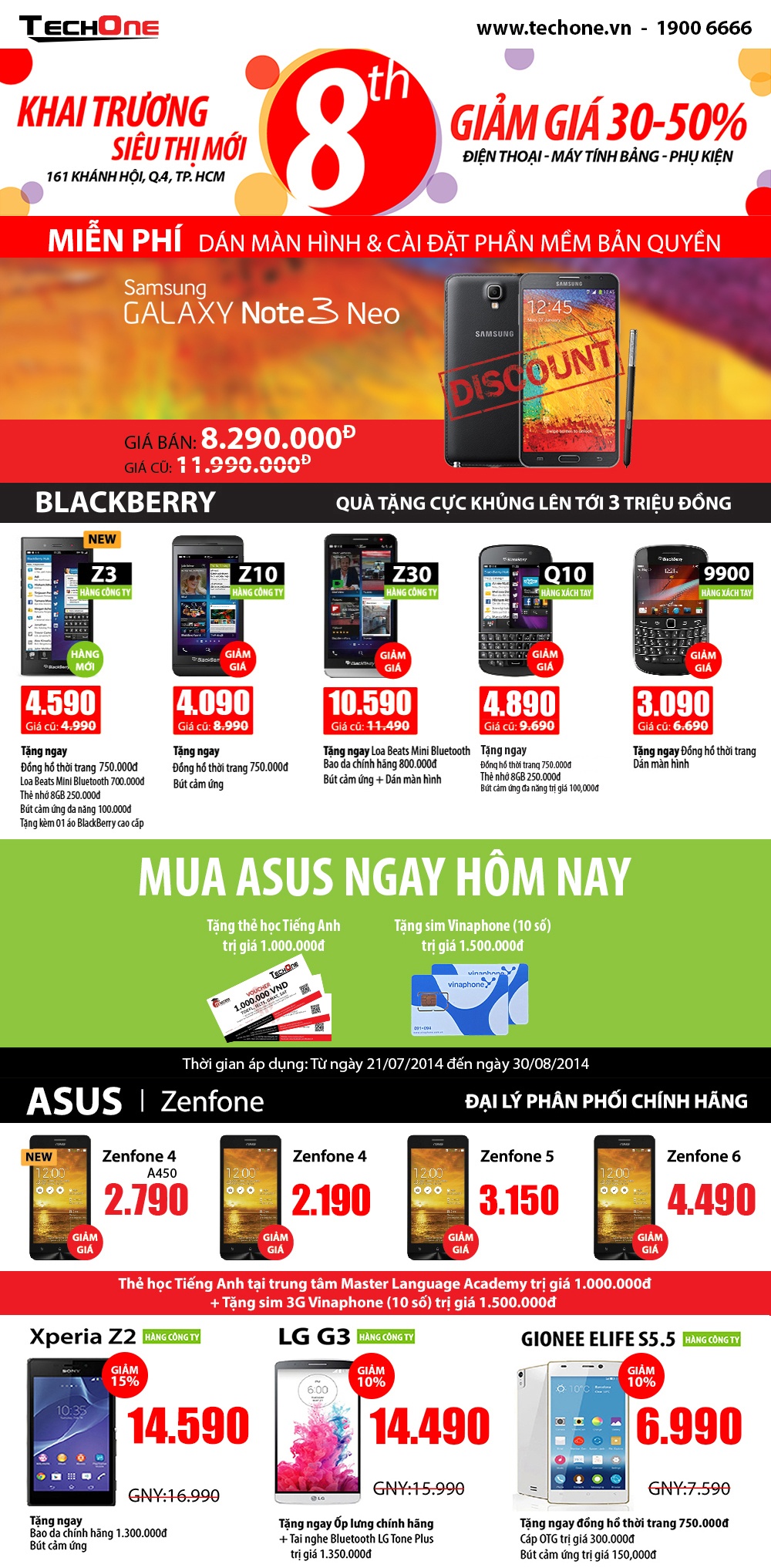 Không ngừng nỗ lực hoàn thiện hướng đến sự hoàn hảo về chính sách bán hàng, bảo hành, hậu mãi năm 2014 với việc mở rộng quy mô hệ thống vào thị trường phía Nam. TechOne hứa hẹn sẽ trở thành điểm mua sắm quy mô, hiện đại, chuyên nghiệp, mà vẫn gần gũi, thân thiện với khách hàng. Mừng khai trương siêu thị thứ 8 tại 161 Khánh Hội, quận 4, TP.HCM, Techone triển khai chuỗi chương trình khuyến mại cho khách đến mua hàng tại showroom.