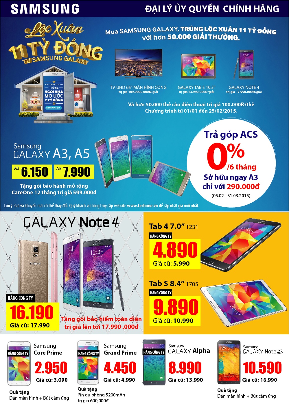 Hiện tại, TechOne cũng phối hợp với công ty tài chính ACS triển khai chương trình hỗ trợ mua trả góp Samsung Galaxy A3 lãi suất 0% với giá chỉ 6,29 đồng. Theo đó, khách hàng chỉ phải trả trước 290.000 đồng và trả góp dần trong kỳ hạn 6 tháng với lãi suất 0%, mỗi tháng chỉ trả 1 triệu đồng. Ngoài ra, người mua còn được tặng ngay 12 tháng bảo hành mở rộng CareOne trị giá 690.000 đồng, nâng thời gian bảo hành lên 24 tháng cùng nhiều quà tặng hấp dẫn khác.