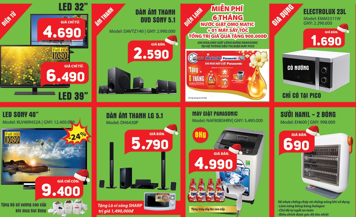 Mùa Giáng sinh và năm mới luôn là thời điểm mua sắm lớn nhất trong năm. Đây là dịp để mọi người sắm cho mình những món đồ ưa thích sau một năm làm việc chăm chỉ cũng như mua tặng cho bạn bè, người thân những món quà ý nghĩa nhân dịp năm mới sắp đến. Hiểu rõ tâm lý khách hàng, Pico sớm chuẩn bị nhiều chương trình khuyến mại, giảm giá để phục vụ nhu cầu mua sắm hàng điện máy của đông đảo người tiêu dùng cả nước.