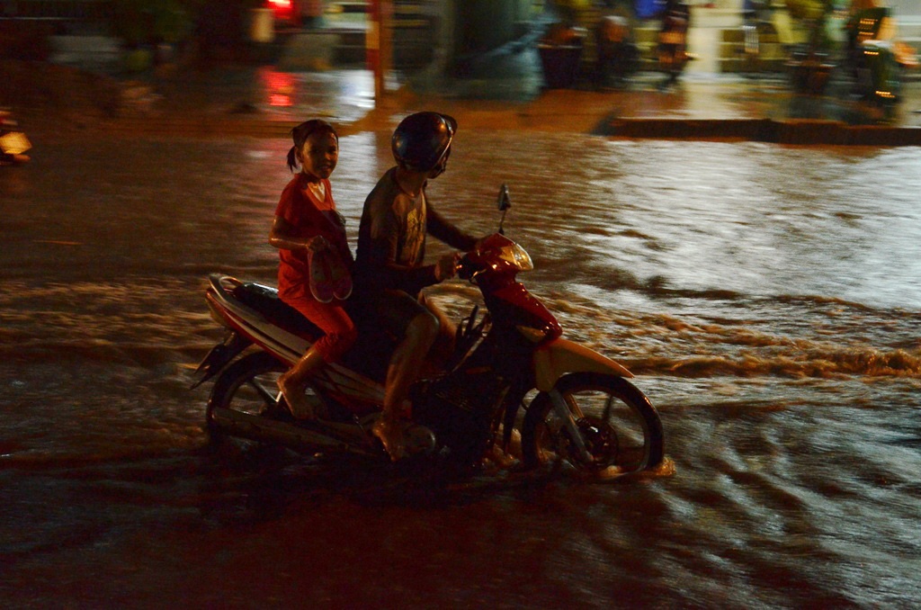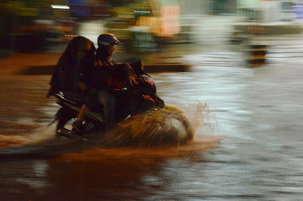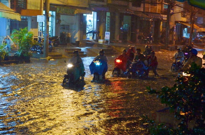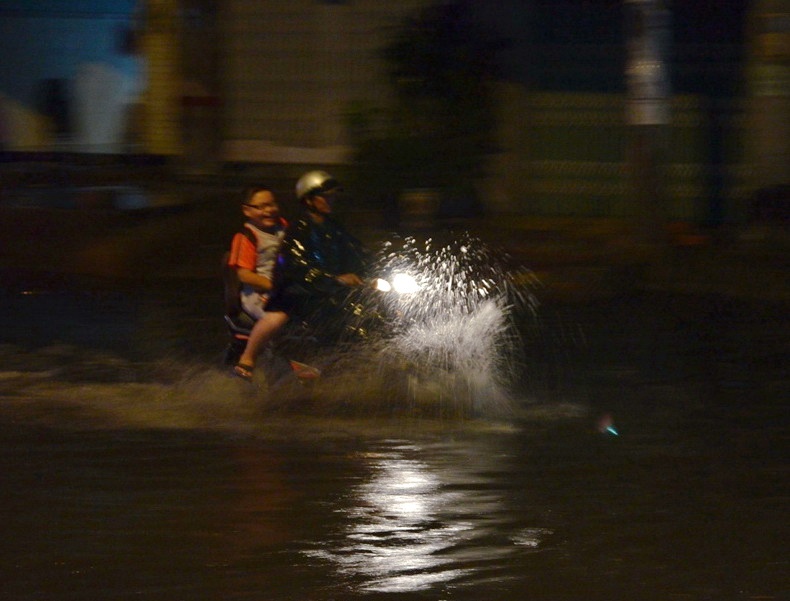 | Chạy xe qua đường Tân Hóa (Q.6) đầy nước để về nhà. |