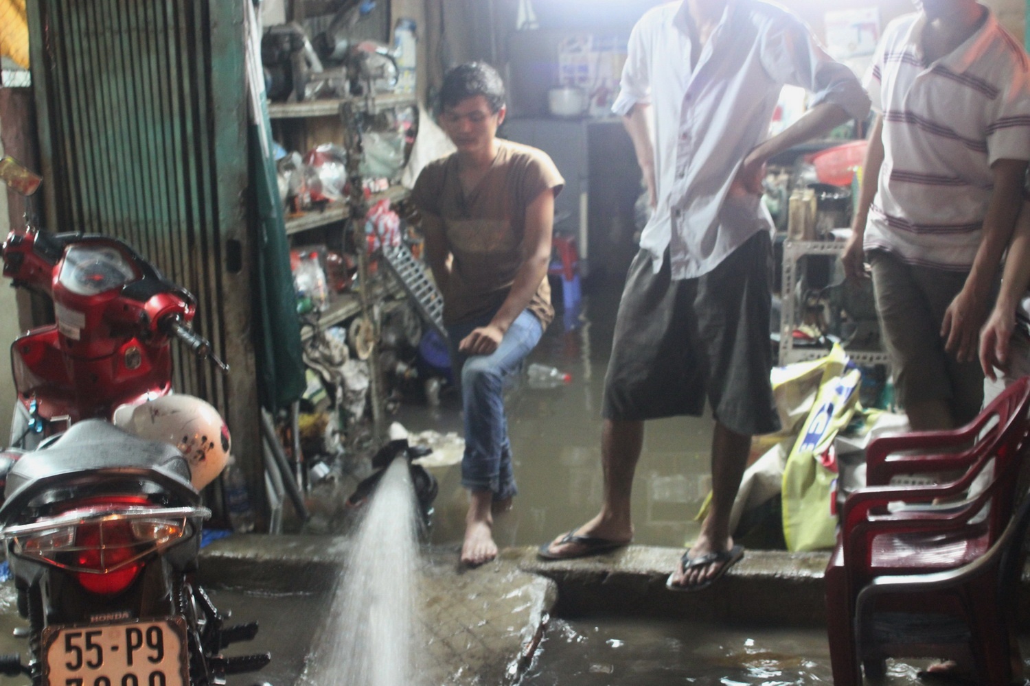 Người dân dùng bơm hút nước ra khỏi nhà ở đường Phan Huy Ích