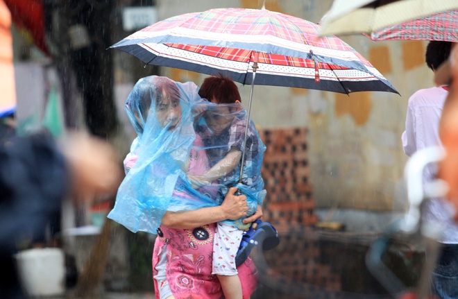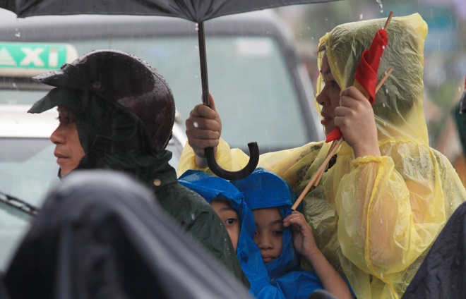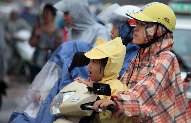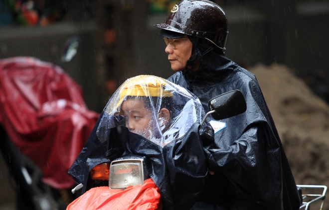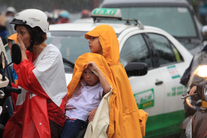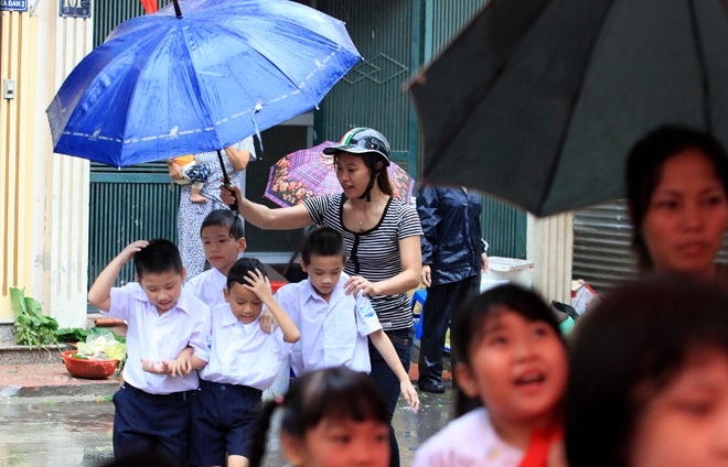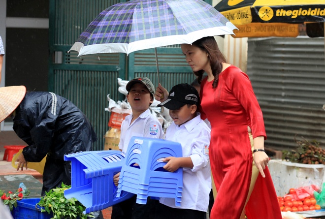 | Ánh mắt ngơ ngác của heo vàng lớp 1, mưa lớn nhưng các các bé vẫn tỏ ra háo hức trong ngày đầu tiên của năm học mới. |