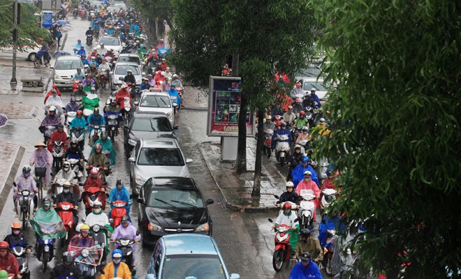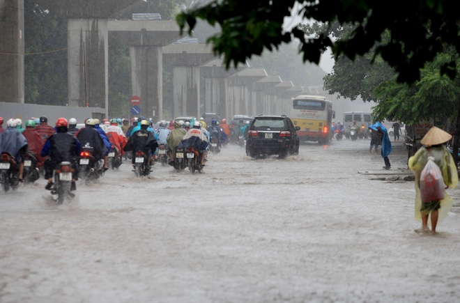 | Cơn mưa nặng hạt hàng giờ đồng hồ làm tắc dài nhiều tuyến phố. |