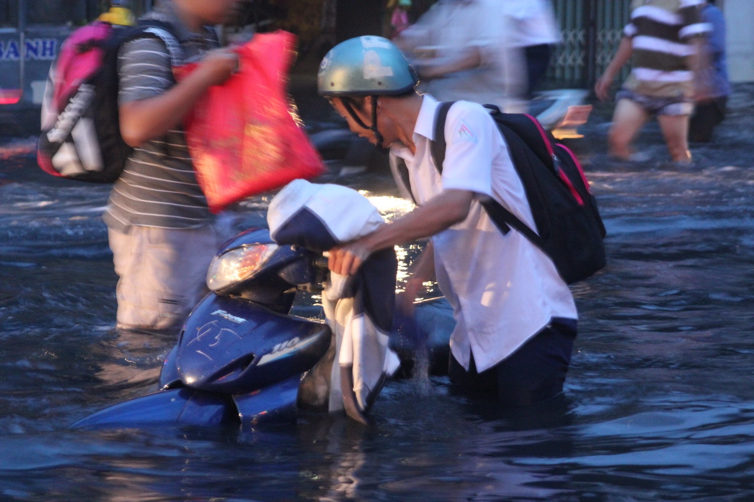 | Cô bé hì hục đẩy xe chết máy rất "khí thế" để cùng phụ huynh vượt qua đoạn đường ngập nổi tiếng - đường Hòa Bình. |