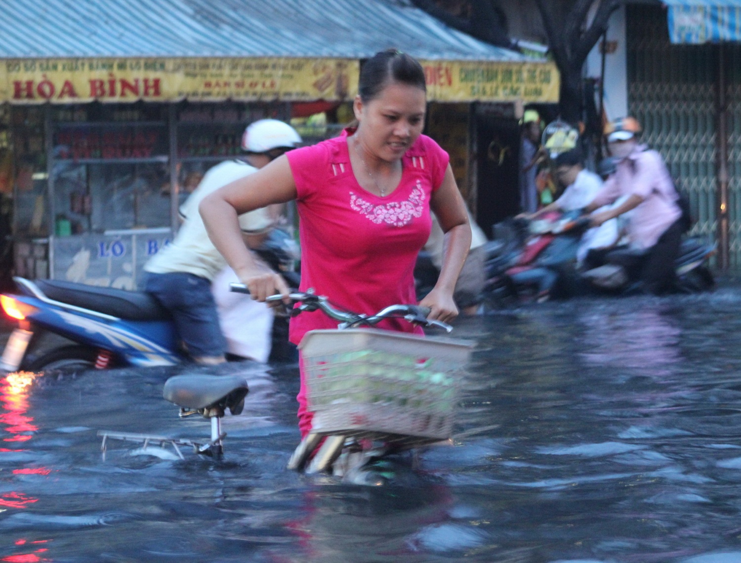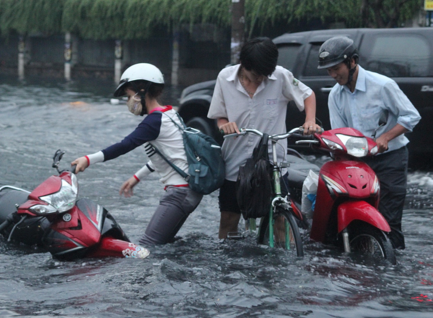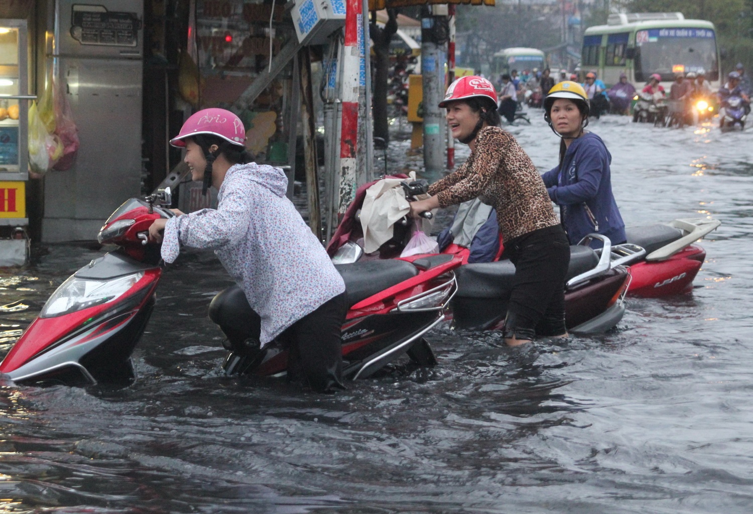| Ba phụ nữ vất vả đẩy xe bị chết máy và một người vất vả dắt xe đạp bị nước ngập đến yên ở đường Hòa Bình. |